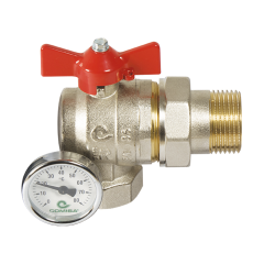 Ъглов кран за колектор 1"M x 1"F с холендрова връзка и термометър, черв. Т-дръжка